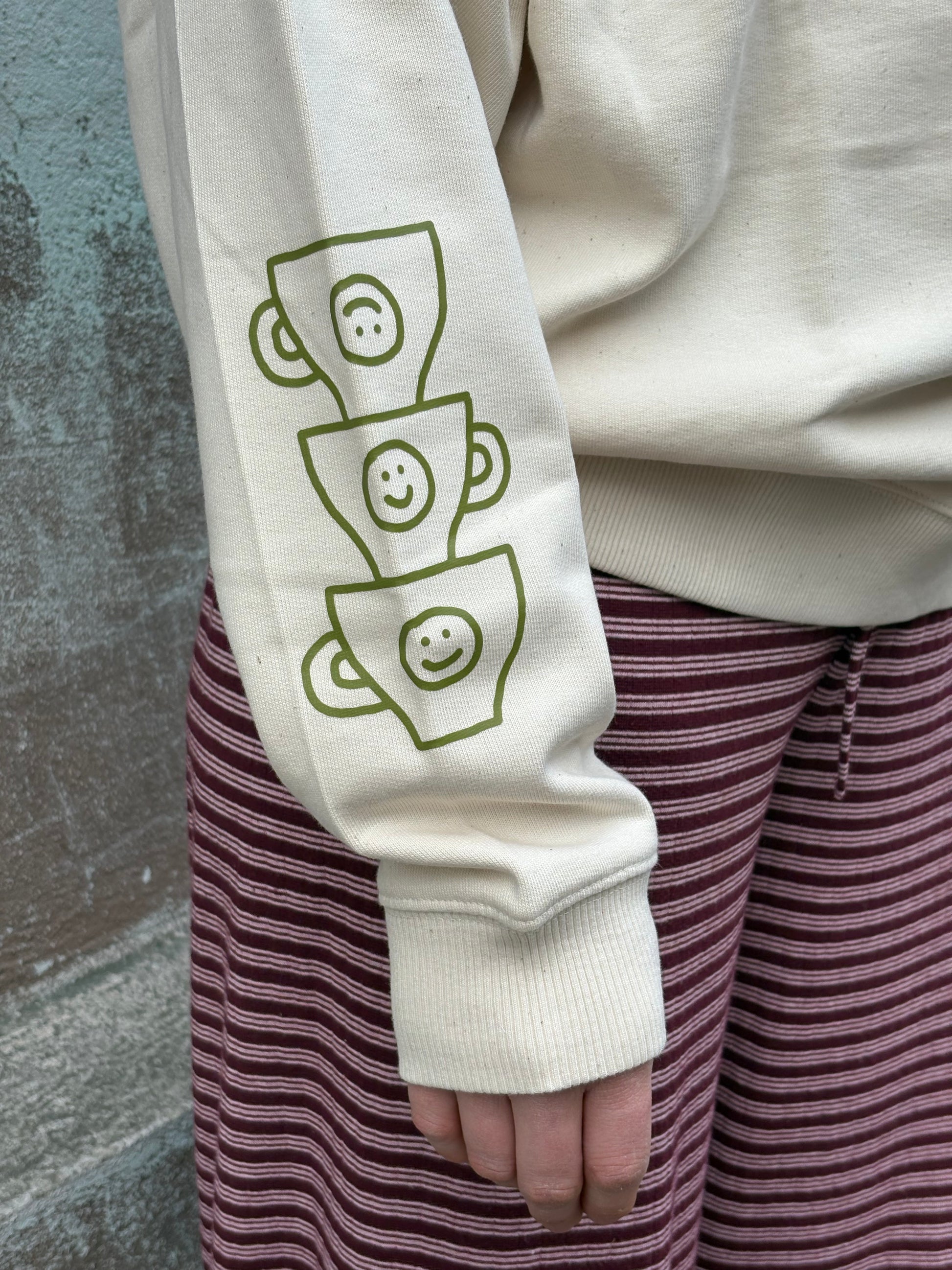 Oversized sweatshirt in beige with green screen print, perfect for those who like to have a little fun with their fashion. Features a unique design, with 2x1 ribbing at the collar, sleeve cuffs, and bottom hem. Detailed stitching and an inner herringbone neck tape add extra charm. Made from 100% pre-washed, premium, organic cotton.